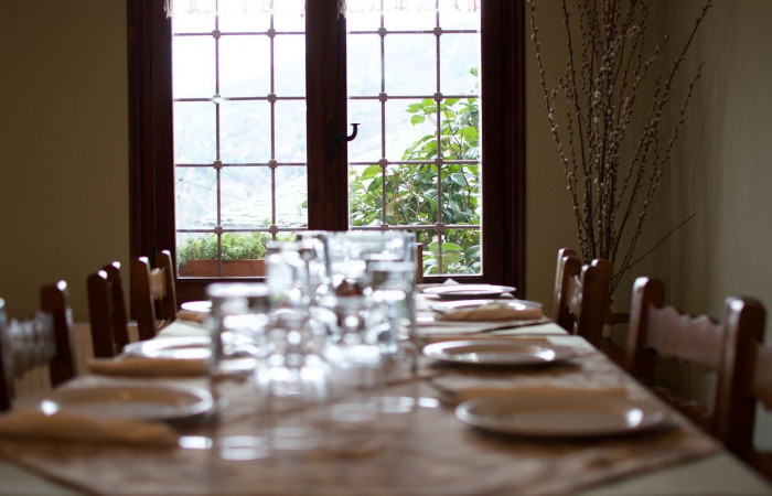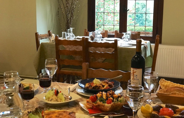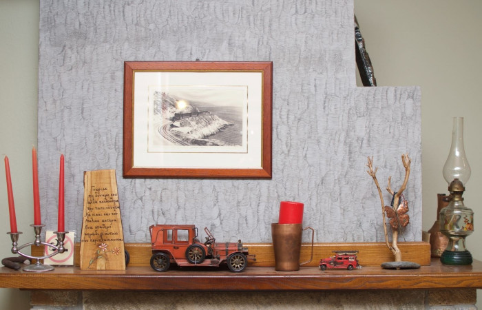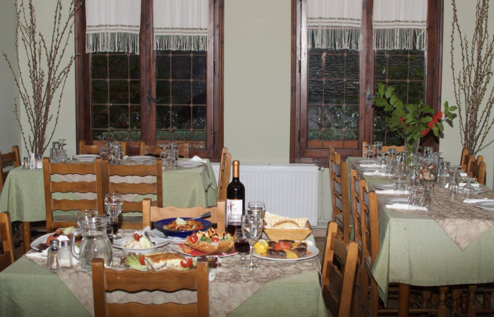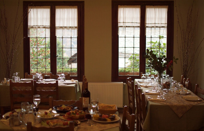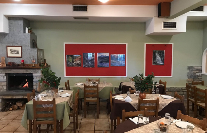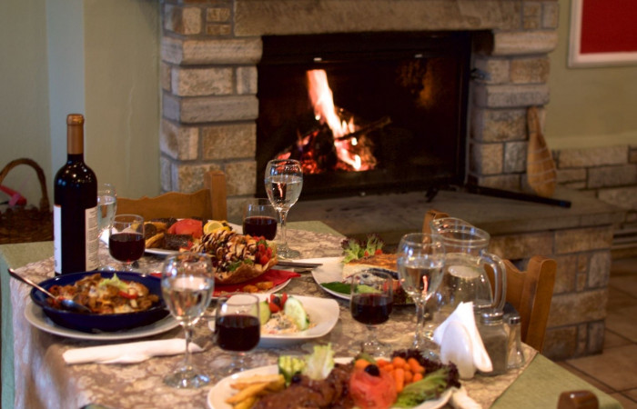 Μεγάλα κούτσουρα στο πέτρινο τζάκι προσφέρουν θαλπωρή αλλά και μια ακόμη πινελιά σε ένα χώρο διακοσμημένο με αντικείμενα που σε ταξιδεύουν σε άλλη εποχή. Παστέλ χρώματα, τοιχογραφίες και παλιές φωτογραφίες ζεσταίνουν τη σάλα.