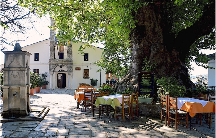 Το σκηνικό αλλάζει την εποχή που το βουνό ντύνεται στα πράσινα. Τότε βγαίνουμε έξω. Τραπεζάκια γύρω από το πλατάνι με τον ήχο του νερού της βρύσης και με θέα την πλαγιά που ξεχύνεται προς το Αιγαίο, απολαμβάνουμε της ηλιόλουστες μέρες της Άνοιξης και του Καλοκαιριού με καλή παρέα, ποτό & φαγητό.
